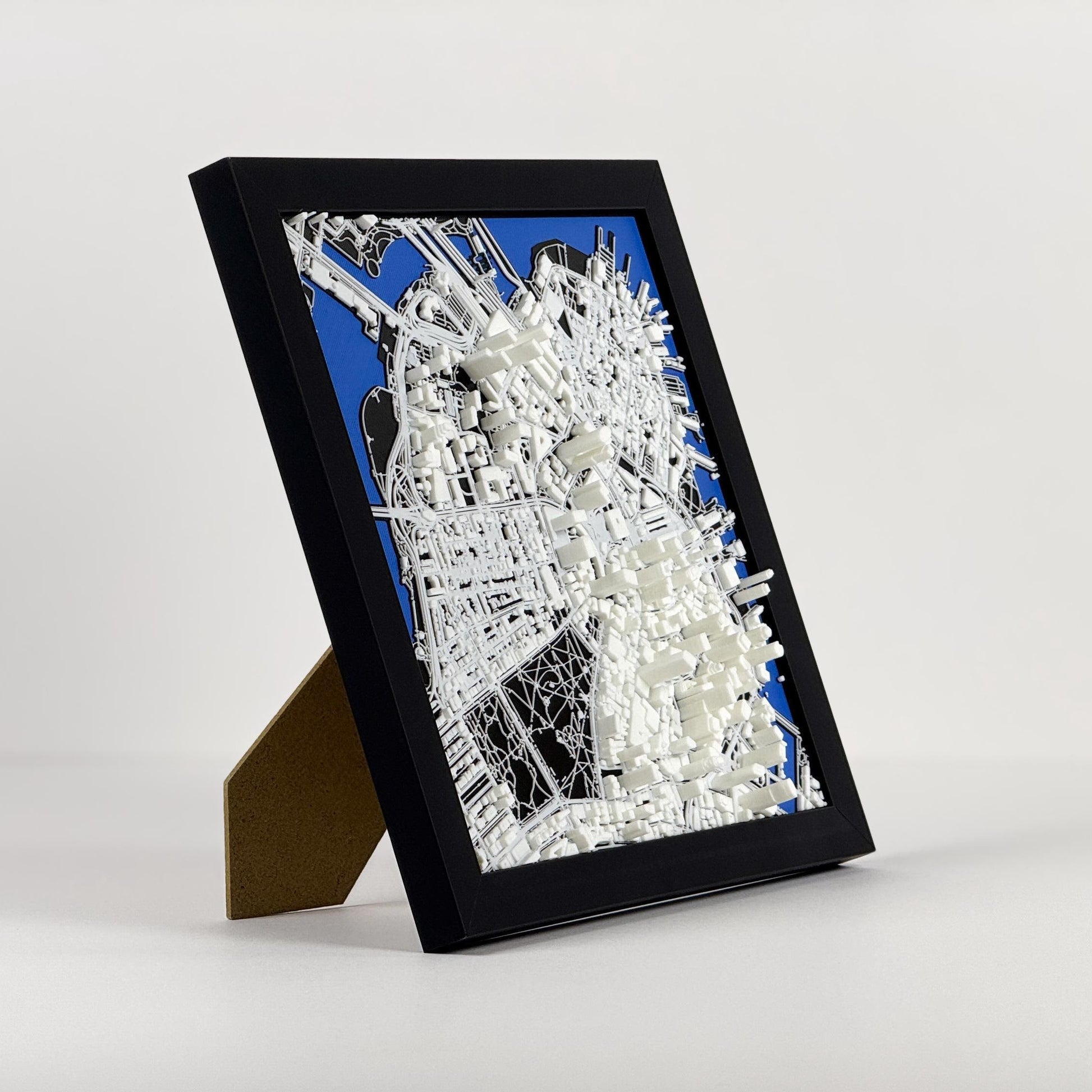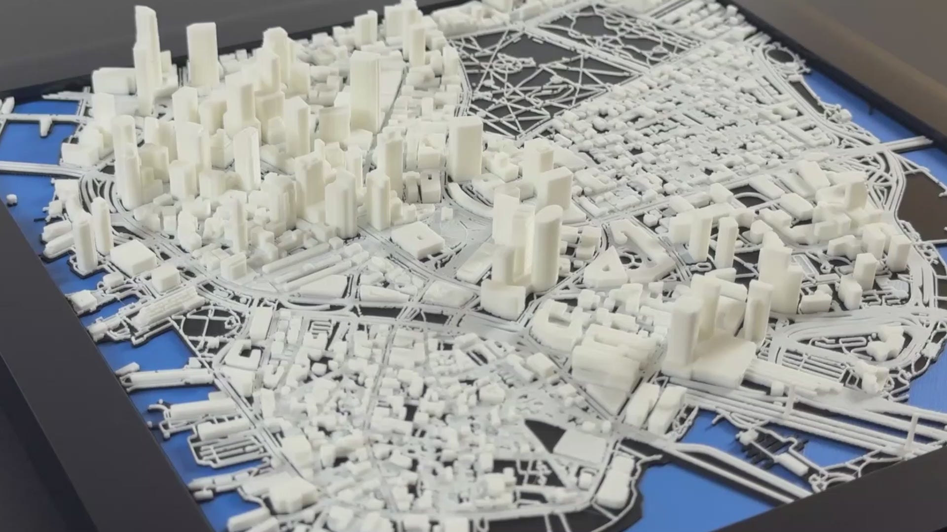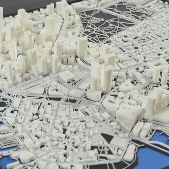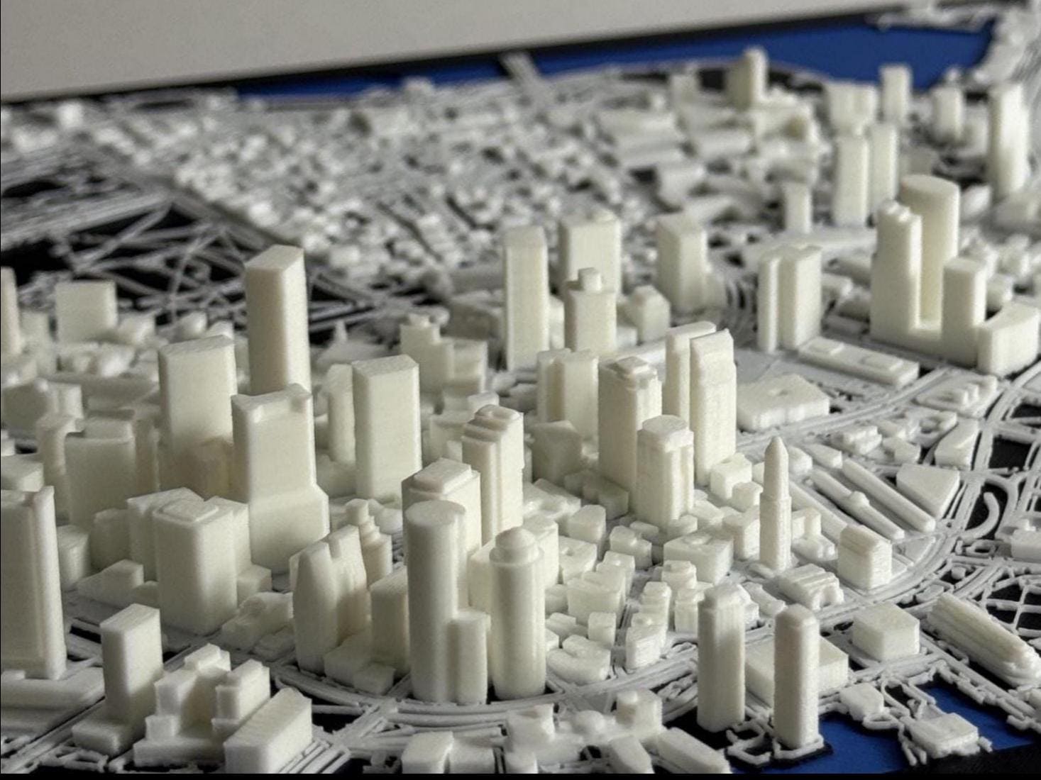 Highly-detailed 1:10,000 scale replica of Boston. Featuring landmarks like the Boston Common, Massachusetts State House, and Faneuil Hall. Modeled by combining open-source data with tens to hundreds of hours of manual 3D modeling. 3D printed in hundreds of layers thinner than a sheet of paper.