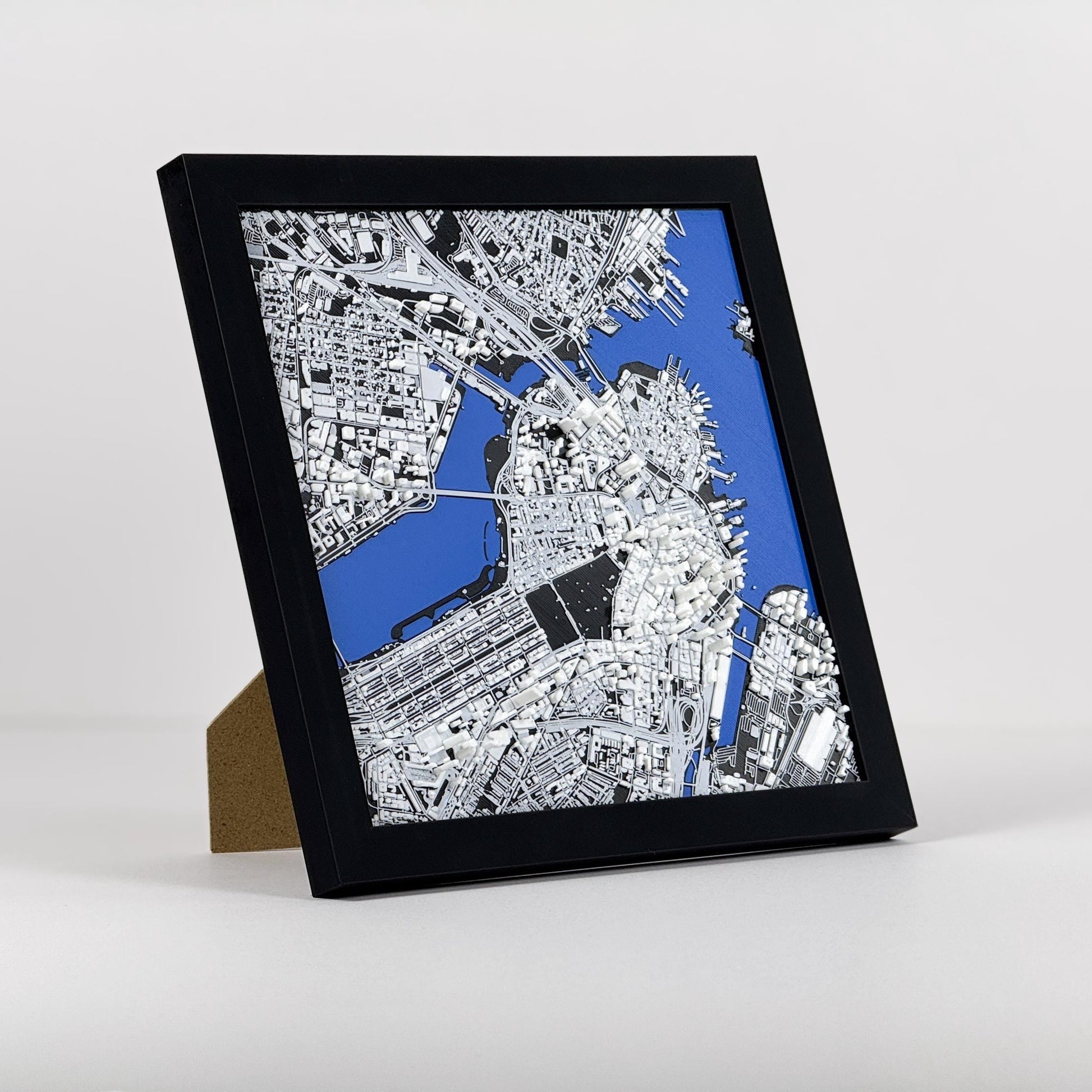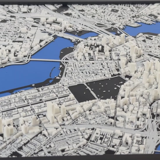 Highly-detailed 1:20,000 scale replica of Boston. Featuring landmarks like the Boston Common, Massachusetts State House, and Faneuil Hall. Modeled by combining open-source data with tens to hundreds of hours of manual 3D modeling. 3D printed in hundreds of layers thinner than a sheet of paper.